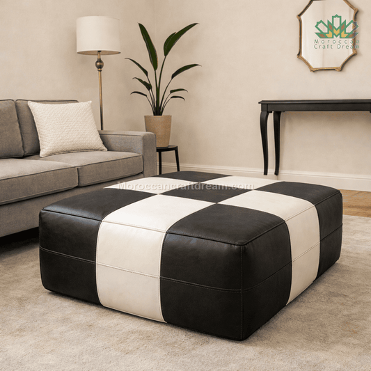 Discover our collection of oversized Moroccan leather ottomans designed to function as statement coffee tables. Each piece is handcrafted by skilled artisans using carefully selected genuine leather, combining traditional Moroccan craftsmanship with modern interior design expectations.