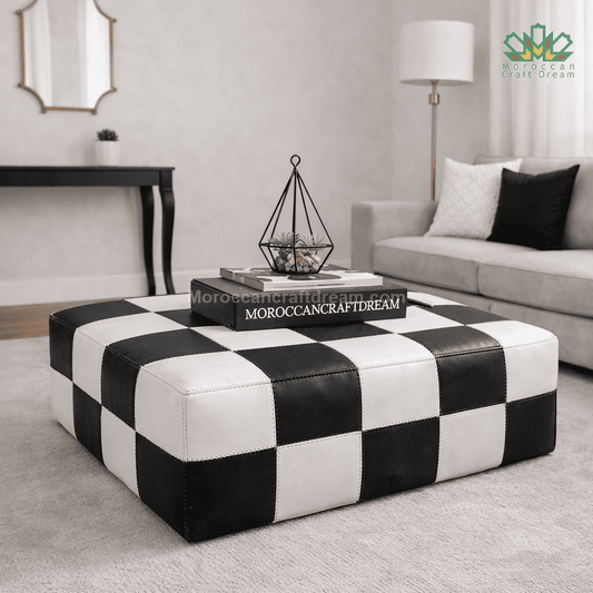 Discover our collection of oversized Moroccan leather ottomans designed to function as statement coffee tables. Each piece is handcrafted by skilled artisans using carefully selected genuine leather, combining traditional Moroccan craftsmanship with modern interior design expectations.