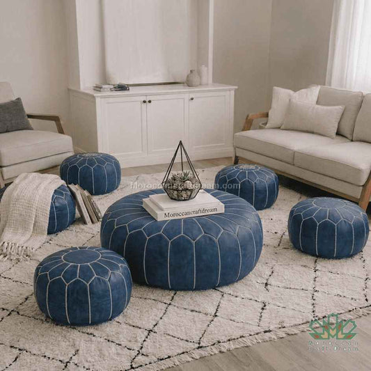 Elevate your interior with our exquisite leather pouf collection, featuring genuine Moroccan ottomans that serve as both functional seating and stunning decorative accents. Each pouf is hand-stitched by master leather artisans using premium, vegetable-tanned leather sourced from traditional Moroccan tanneries.