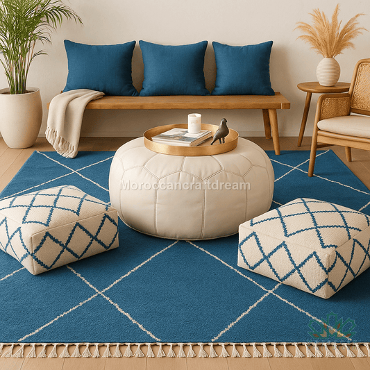 Original Vintage Beni Ourain pouf Blue White PBW4WH
